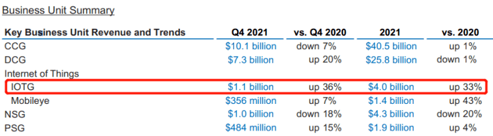 在晶圓代工巨頭臺(tái)積電公布的財(cái)報(bào)中,2021年其手機(jī)業(yè)務(wù)營(yíng)收首次被HPC(大型高性能計(jì)算)業(yè)務(wù)超越,面向汽車(chē)板塊的營(yíng)收和訂單需求也猛增。 圖像傳感器芯片設(shè)計(jì)龍頭韋爾股份最新財(cái)報(bào)顯示,其半導(dǎo)體業(yè)務(wù)收入同比增長(zhǎng)18%,雖然智能手機(jī)CMOS占據(jù)營(yíng)收大頭,但業(yè)績(jī)?cè)鲩L(zhǎng)主要來(lái)源于車(chē)載CIS與安防CIS,尤其在安防領(lǐng)域?qū)崿F(xiàn)高達(dá)60%的業(yè)績(jī)?cè)鲩L(zhǎng)。 2021年物聯(lián)網(wǎng)事業(yè)部(IoTG)成為國(guó)際半導(dǎo)體巨頭英特爾增長(zhǎng)最快的業(yè)務(wù),同比增長(zhǎng)33%,同時(shí)汽車(chē)自動(dòng)駕駛業(yè)務(wù)也增速驚人,反觀主營(yíng)PC終端的CCG部門(mén)業(yè)績(jī)僅增1個(gè)百分點(diǎn)。